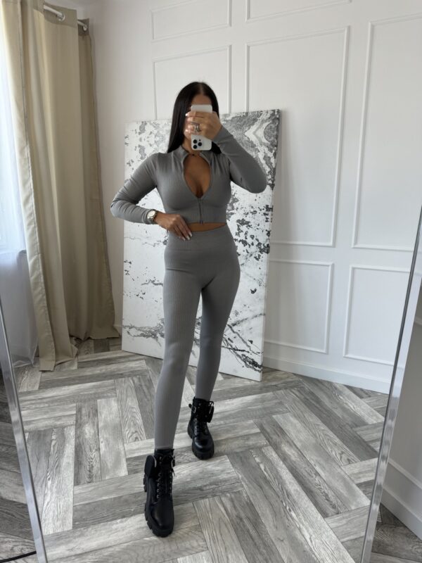 Komplet prążkowany modelujący top na zamek z długim rękawem + legginsy push-up szary CASEY